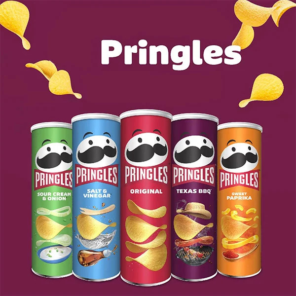 این برند در سال ۲۰۱۲ به شرکت معروف تولیدکننده غلات صبحانه (کلاگ) Kellogg واگذار شد و امروزه در بیش از ۱۴۰ کشور جهان به فروش میرسد و درآمدی سالیانه معادل ۱٫۴ میلیارد دلار به همراه دارد. چیپس سیب زمینی پرینگلز اولین بار در اکتبر سال ۱۹۶۸ در ایالات متحده وارد بازار اصفهان شد و حدود ۷ سال بعد عرضه ان در سطح بینالمللی شروع شد. حکایت های مختلفی دربارهٔ نام پرینگلز شدهاست که یکی از آنها مربوط به شخصی به نام مارک پرینگلز میباشد که در سال ۱۹۳۷ روشی در فراوری سیب زمینی را در آمریکا به ثبت رساند و بعداً توسط شرکت P&G برای بهبود مزه سیب زمینی خشک شده و فراوری شده مورد استفاده قرار گرفت. قصهای دیگر حاکی از آن است که ۲ نفر از کارمندان بخش بازاریابی شرکت P&G در محلی به نام پرینگلز زندگی میکردند و چون از نظر آوا پرینگلز با پوتیتو (سیب زمینی) همخوانی داشته پیشنهاد این اسم مطرح گشتهاست. داستان به وجود آمدن پرینگلس اینگونه آغاز شد که شرکت P&G تصمیم گرفت تا چیپسهایی با کیفیت عالی تولید کند که شکایتهای مصرفکنندگان دربارهٔ شکسته و خرد بودن چیپسها، چرب بودن آنها، و کهنه و غیر ترد بودن آنرا را مرتفع سازد. در اواسط دهه ۶۰ میلادی یکی از محققین شرکت بنام الکساندر لیپا توانست مزه مورد نظر را پیدا کند و شکل چیپس نیز که یک شکل هایپربولیک پارابولوید است توسط ژنه ولف که یک مهندس مکانیک و نویسنده رمانهای علمی تخیلی و فانتزی بود طراحی شد. نکته قابل توجه دربارهٔ چیپس پرینگلز این است که این محصول تنها محتوی ۴۲٪ سیب زمینی است و بقیه آن از موادی چون آرد سیب زمینی، ذرت، برنج و.. تشکیل شدهاست که با روغن نباتی و امولسیفایر ترکیب شدهاست. همین موضوع باعث شدهاست که بقیه تولیدکنندگان چیپس سیب زمینی پرینگلس را محکوم کردهاند که اصلاً چیپس نیست و به همین دلیل در سال ۱۹۷۵ شرکت مجبور شد که به جای استفاده از لغت " چیپس " روی بستههای خود جمله " چیپس سیب زمینی تهیه شده از سیب زمینی خشک" استفاده کند. شعار تبلیغاتی پرینگلس "once you pop, you just can’t stop" که به معنی "وقتی بازش کنی دیگه نمیتونی بس کنی" میباشد. این چیپس در مزه های متعددی به بازار عرضه میشود که مزههای اصلی آن شامل کلاسیک، نمک و سرکه، خامه ترش و پیاز، پنیر چدار، سس رنچ و سس باربکیو است. بعضی از مزهها فقط در بعضی از بازارها عرضه میشوند مثلاً کوکتل میگو، پنیری تند و ادویهای، واسابی (خردل ژاپنی)، بیکن دودی و کاری فقط در بریتانیا و مزه پنیر ماتزارلا با سس مارینرا و فلفل هالوپینو فقط در آمریکا عرضه میشوند